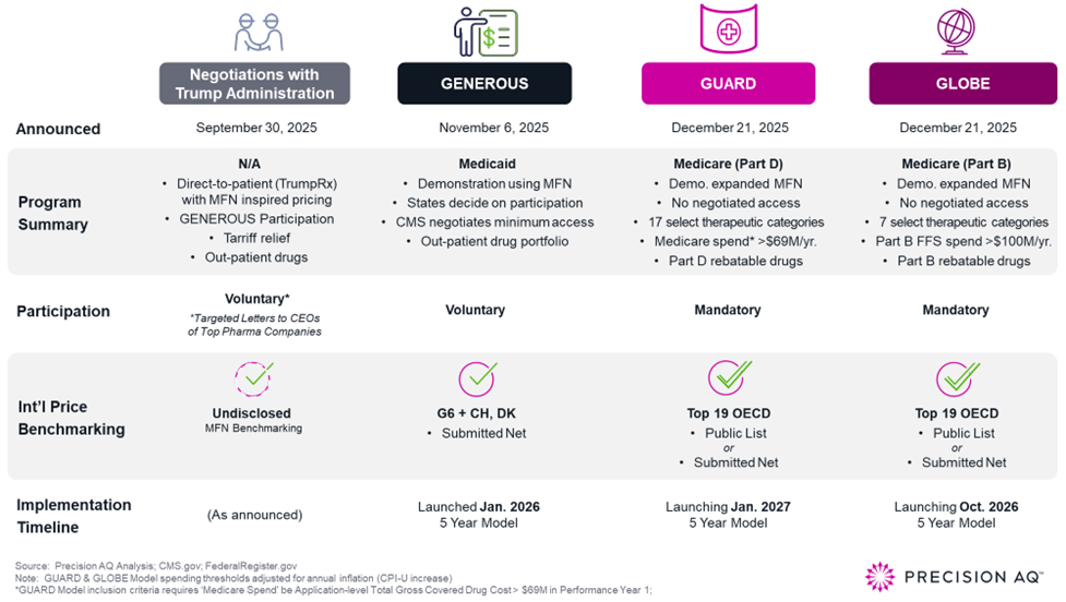 - Model Implementation Timing: Limited windows to adjust MFN reference market pricing remain open with implementation of the GLOBE Model: October 2026, and the GUARD Model: January 2027. Within the current windows, manufacturers can raise ex-U.S. list prices and, potentially, current effective net prices to mitigate future U.S. rebate risks.