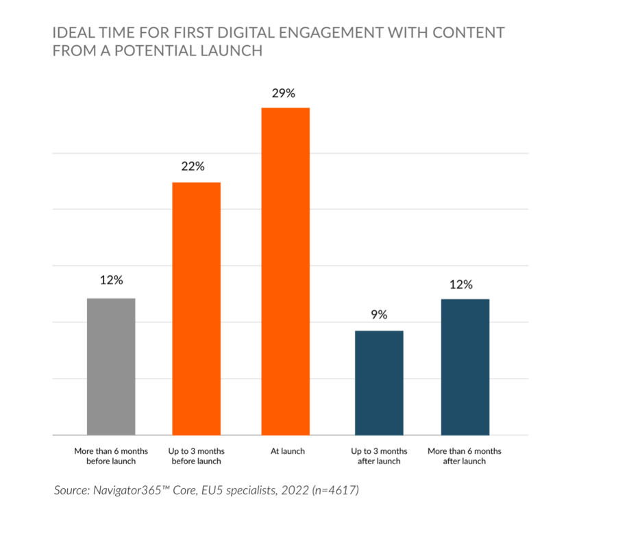 When we asked over 2500, European specialists when they would first like to engage digitally with pharma prior to a product launch, more than 1 in 3 said prior to launch. This opens a critical window for Market Access and Medical teams to connect early with this crucial audience of potential innovators and early adopters–well before Commercial can enter the picture.